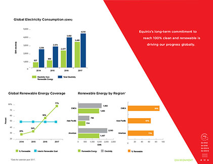 Equinix reports on the four pillars of their ESG program – Environment, People, Community and Governance. These four pillars collectively deliver robust Environment, Social and Governance (ESG) progress towards their goals.