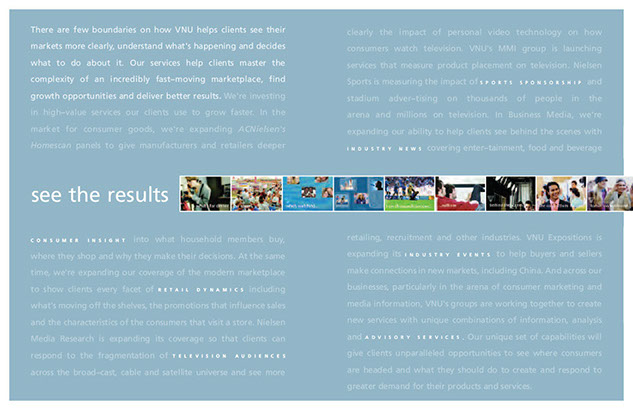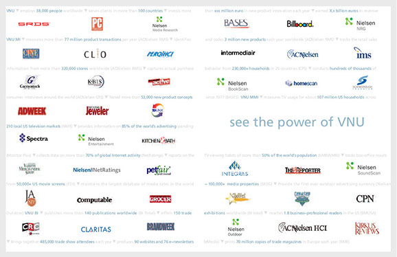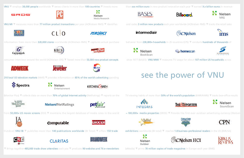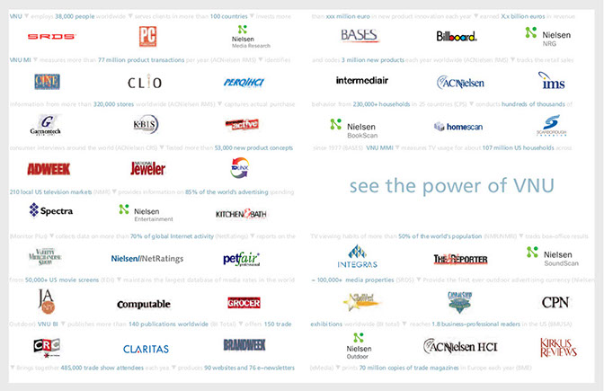 VNU is a Dutch owned publishing conglomerate consisting of such well-known companies and brands as ACNielsen, ADWEEK, Billboard, INTEGRAS, Kirkus Reviews, and The Hollywood Reporter.