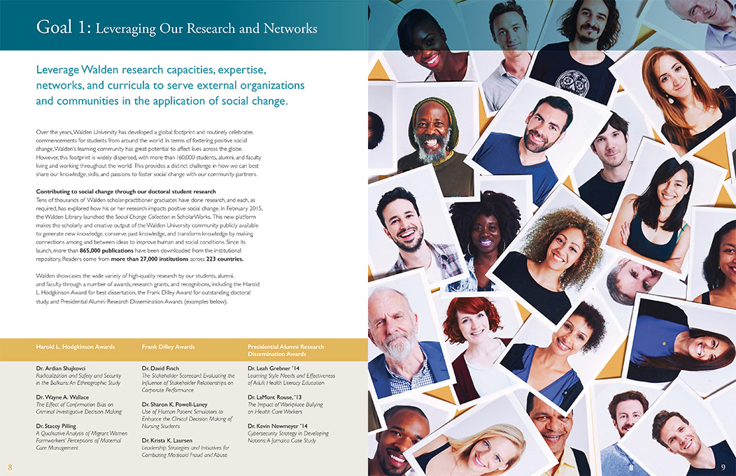 For 45 years Walden University has served the community by providing education and advancement opportunities. Today more than 160,000 students and alumni come from all 50 states and 180 countries. The report introduces Walden 2020: A Vision for Social Change, a working plan to guide the university's efforts to become a leader in connecting otheir virtual presence with both local and global actions to make a difference.