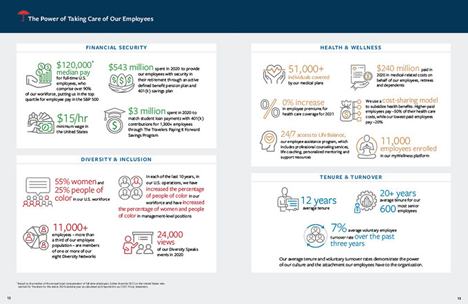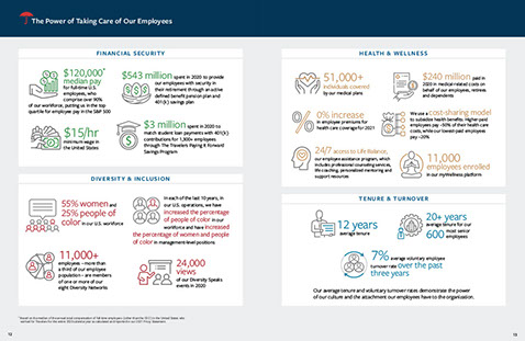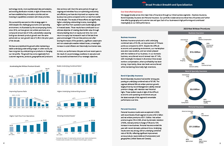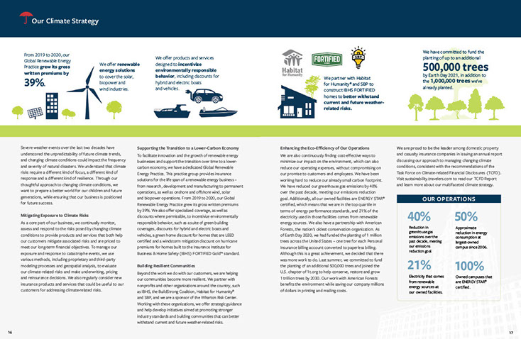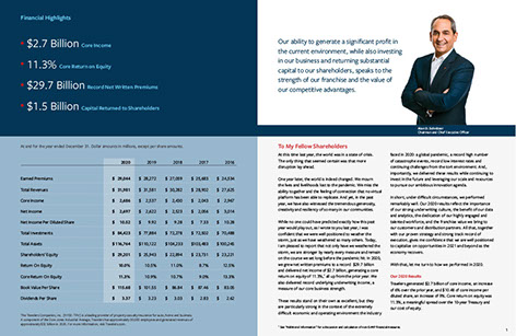 Not only has Travelers weathered the storm of the 2020 pandemic, they are stronger by nearly every measure. Travelers strong results reflect the importance of their underwriting culture, the benefit of their data and analytics and the dedication of a highly engaged and talented workforce. The report not only highlights Travelers record financial strength but also the dedication to their employees well-being, development and the company's commitment to a responsible climate strategy.