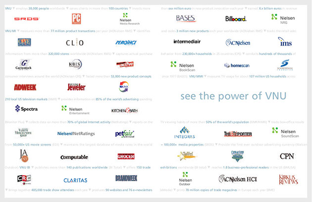 VNU is a Dutch owned publishing conglomerate consisting of such well-known companies and brands as ACNielsen, ADWEEK, Billboard, INTEGRAS, Kirkus Reviews, and The Hollywood Reporter.