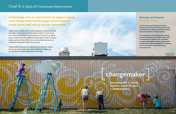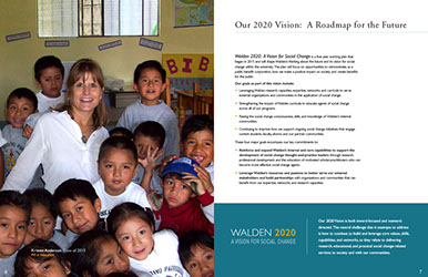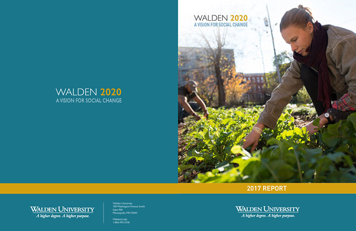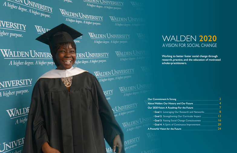 For 45 years Walden University has served the community by providing education and advancement opportunities. Today more than 160,000 students and alumni come from all 50 states and 180 countries. The report introduces Walden 2020: A Vision for Social Change, a working plan to guide the university's efforts to become a leader in connecting otheir virtual presence with both local and global actions to make a difference.